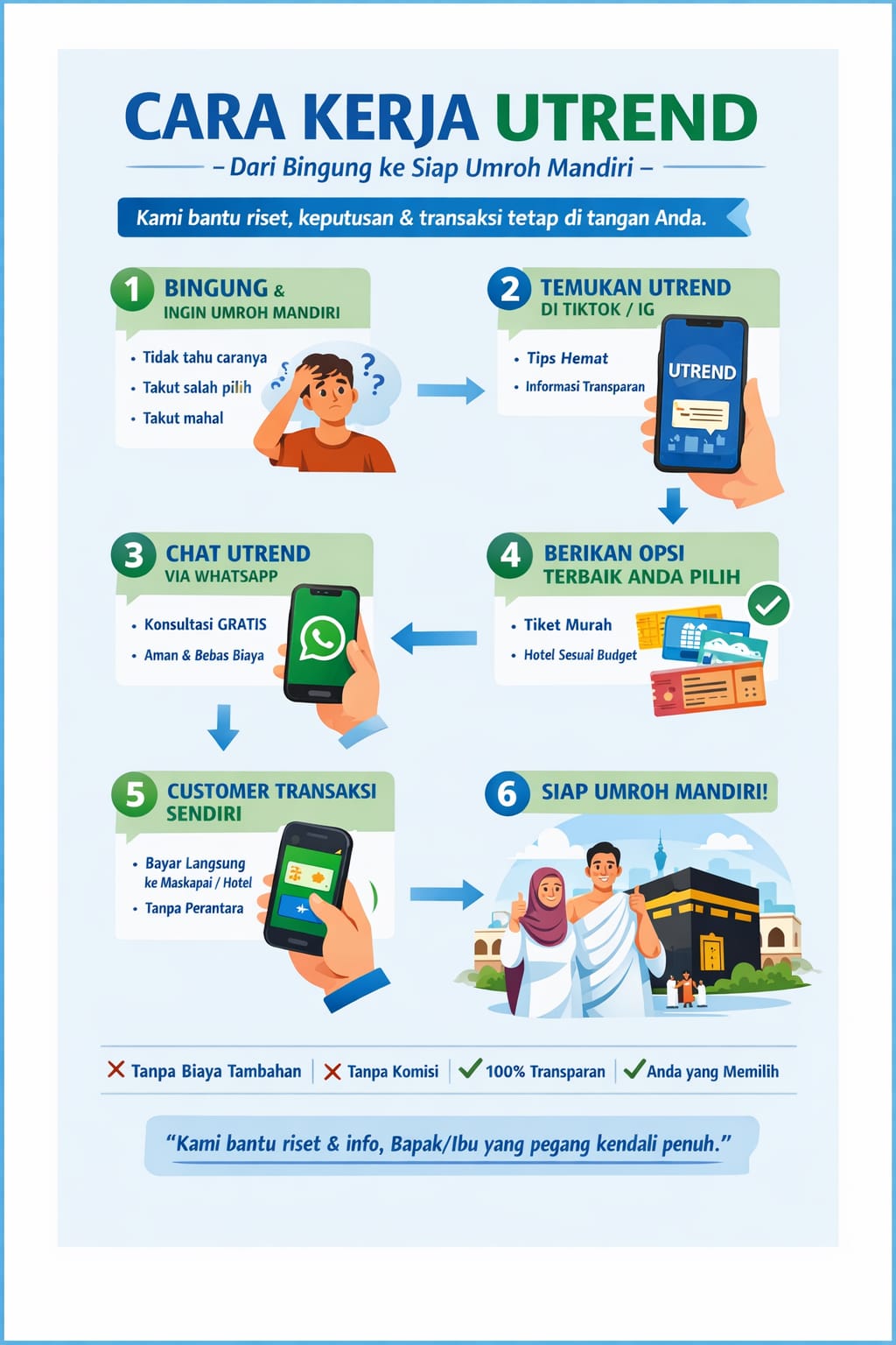 UTREND BUKAN travel. UTREND adalah: Asisten riset & support umroh mandiri. UTREND tidak menjual umroh UTREND menjual ketenangan, waktu, dan kepercayaan. “Kami bantu riset, Anda tetap memegang kendali.”